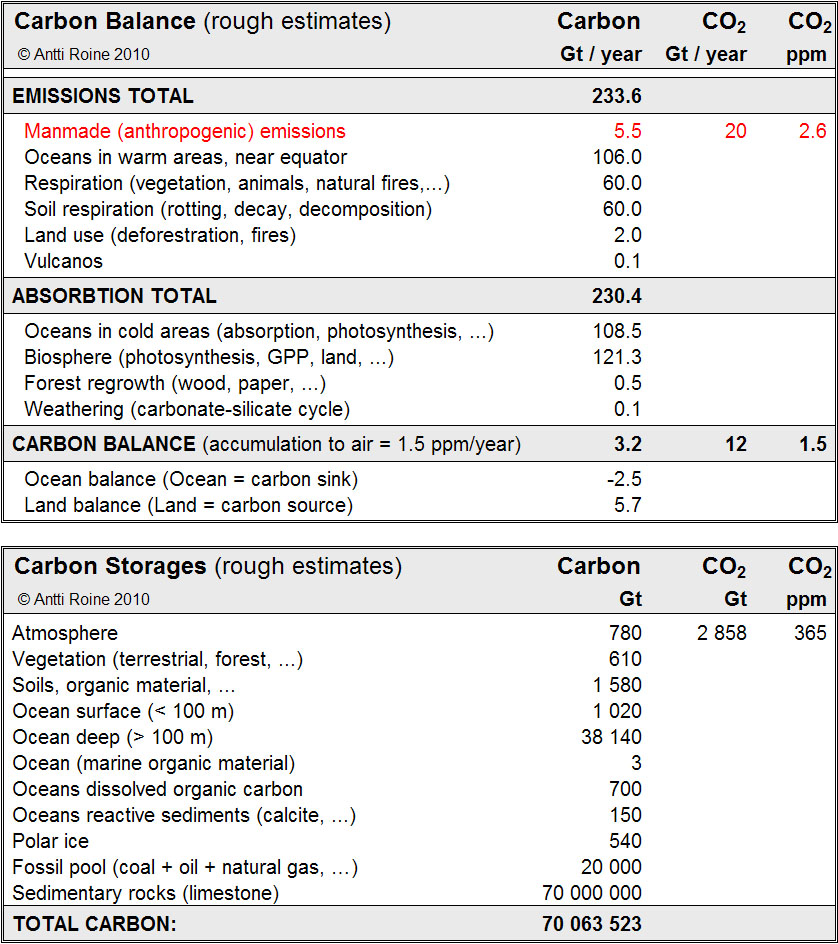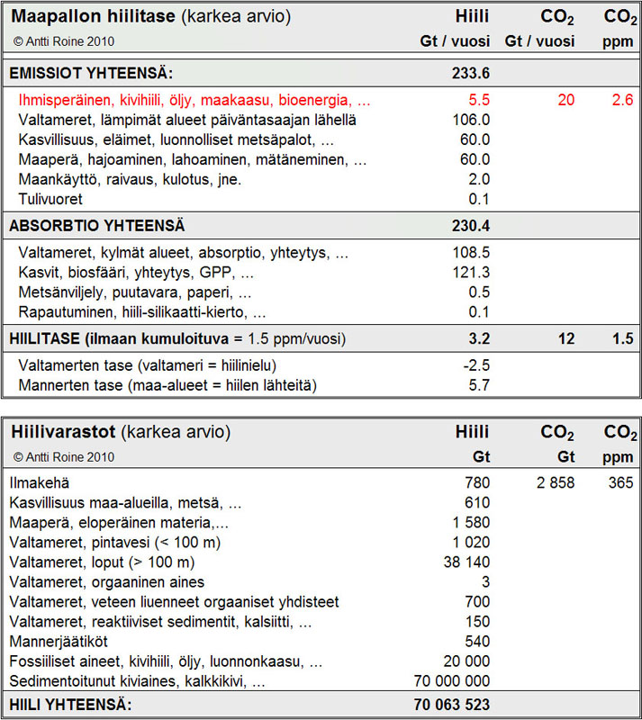 - Maapallon hiilitase ja varastot. Ihmisperäisten hiiliemissioiden määrä on vain 2.4 % luonnon omien hiiliemissioiden määrästä. Ilmakehän hiilidioksidipitoisuus kasvaa joka vuosi noin 1.5 ppm-yksikköä, koska valtamerten pintaveden lämmetessä mereen absorboituva määrä vähenee.
